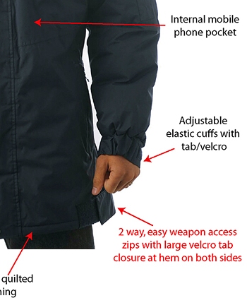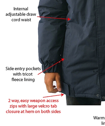 Features side zippers for weapon access, shoulder tabs, microphone loop, adjustable waist and cuffs,